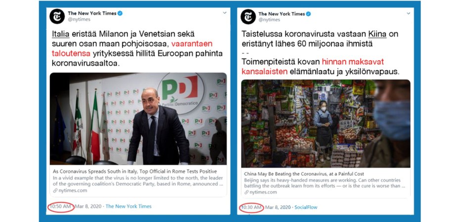 NYT oli näemmä myöhemmin vaihtanut Italia-twiittiin linkitetyn uutisen. Allekirjoittaneen ottamat kuvakaappaukset (yllä) löytyvät myös Fb-jaon kommentteina, 13.3. julkaistuina.