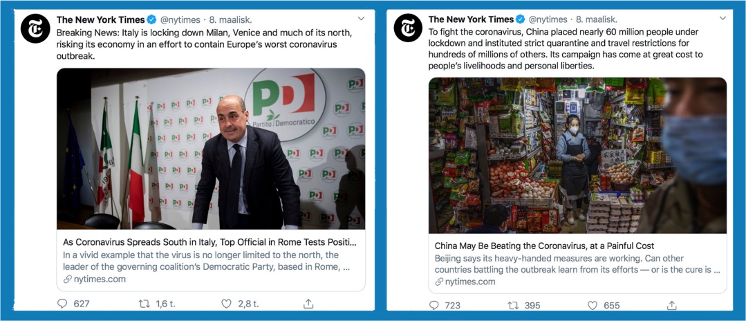 The New York Times twiittasi maaliskuun alussa parinkymmenen minuutin välein samasta aiheesta: valtiollisista poikkeustoimista. Kansalaisten vapauksia rajataan virustaiston nimissä, mutta siinä missä Italia urheasti ”vaarantaa taloutensa”, Kiinassa valtion toimenpiteistä ”hinnan maksavat” ihmiset: