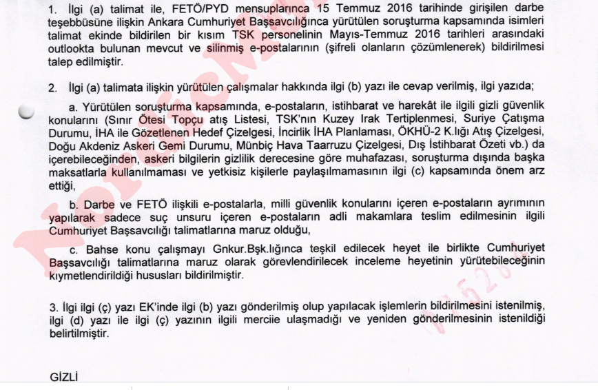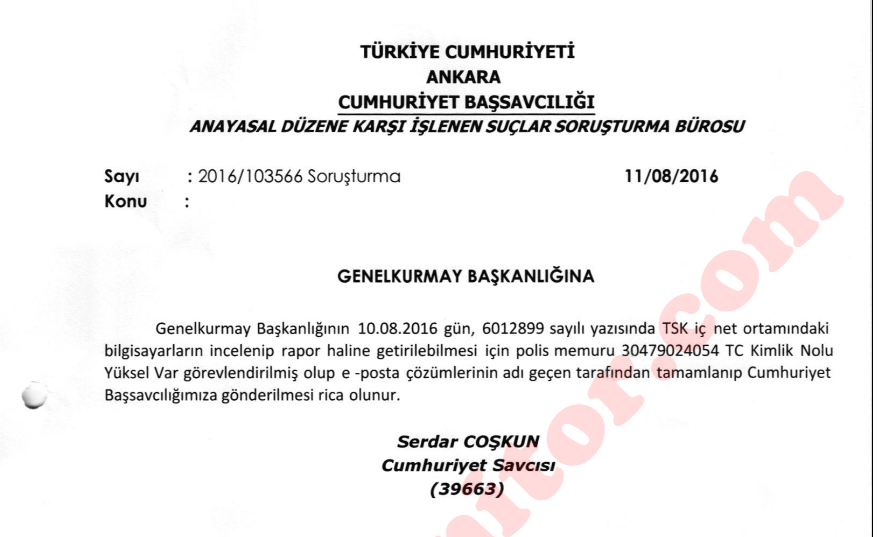 Asiakirjat oli otettu talteen pääesikunnan päämajasta epäonnistunutta vallankaappausyritystä (15.7.2016) koskeneen tutkinnan yhteydessä. Coşkun määräsi arrmeijan luovuttamaan kaiken sähköpostitse käydyn kirjeenvaihdon vallankaappausyritystä edeltäneiltä kahdelta kuukaudelta, mukaan lukien kryptattu viestintä, 1. lokakuuta 2016.