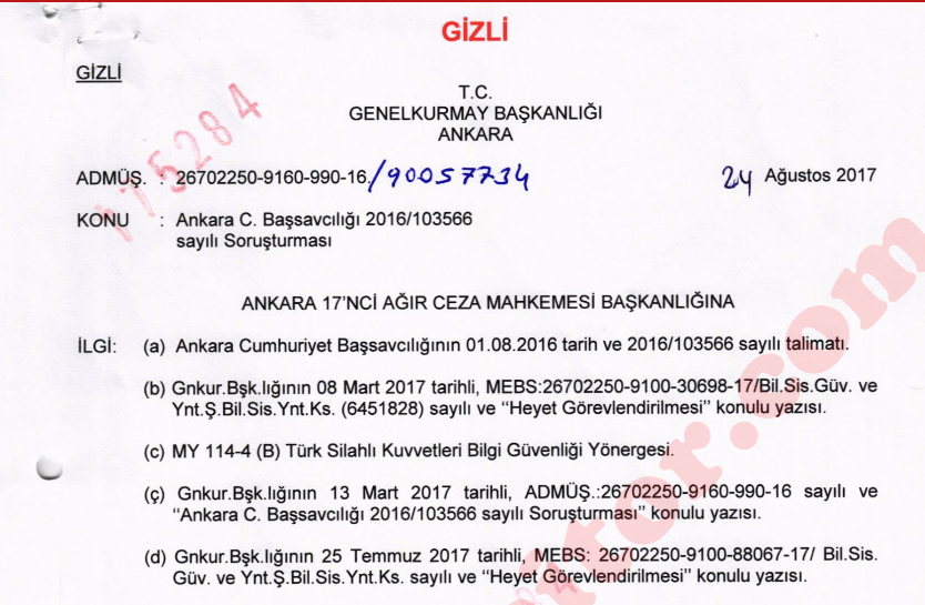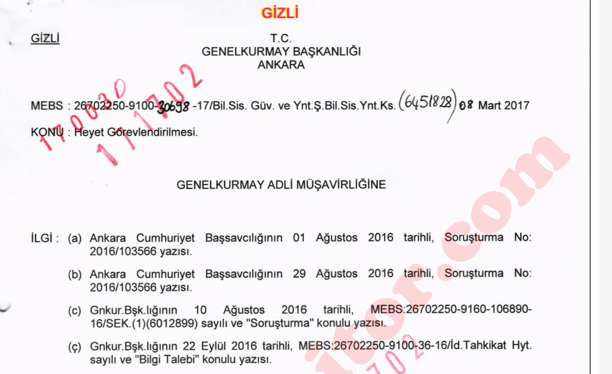 Tarçınin kirjeen jälkeen pääesikuntaa lakiasioissa neuvova eversti Aydın Seviş kirjoitti 24. lokakuuta 2017 Ankaran 17. korkeimmalle oikeudelle toistaen MEBS-johtajan huolet ja kehotti perustamaan komission seulomaan asiakirjat. Korkeimman oikeuden syyttäjät eivät kuitenkaan ilmeisesti jakaneet armeijan huolta ja liittivät kaikki sähköpostit salaisia asiakirjoja sisältävine liitteineen tapauskansioon, paljastaen siten salaiseksi luokiteltua materiaalia, mukaan lukien Kreikkaa koskevat valtaussuunnitelmat, Bozkurt kertoo.