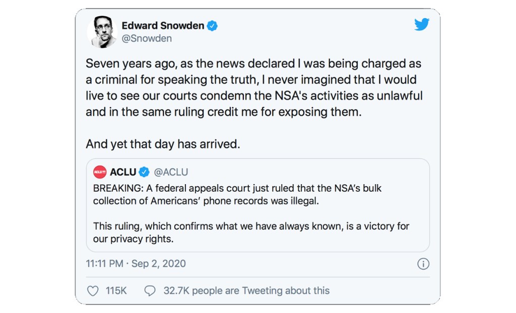 RT (2.9.2020): Snowden did nothing wrong? Court rules NSA spying on Americans’ phones was illegal all along. https://www.rt.com/usa/499742-nsa-spying-illegal-snowden
