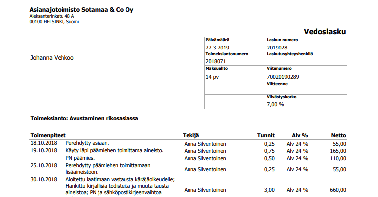 Sotamaa Oy:n laskutus re Johanna Vehkoo