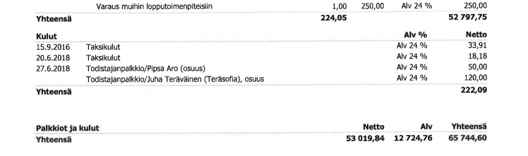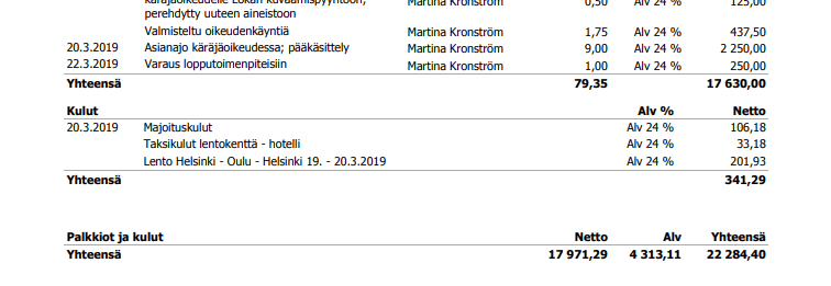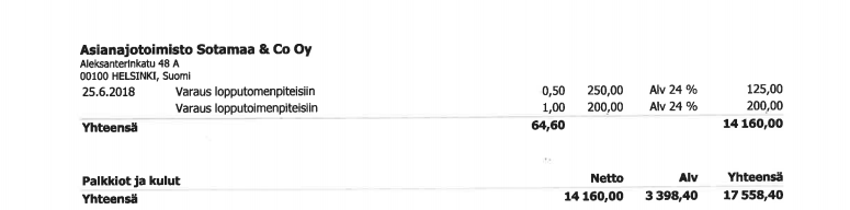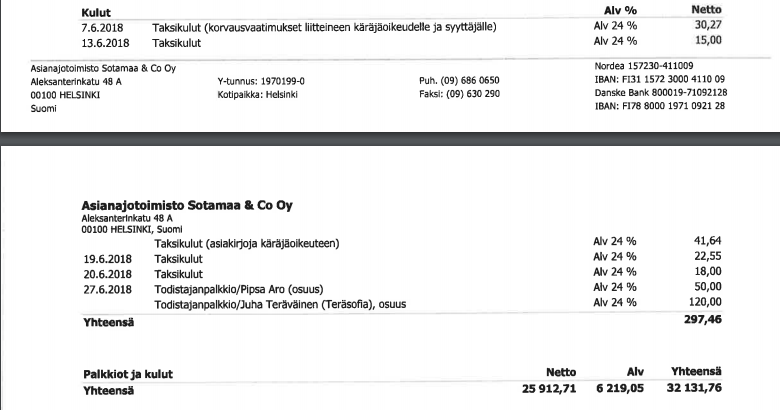 Alla kuvakaappauksia Aron, Jantusen ja Vehkoon asioita ajavan asianajaja Martina Kronströmin firman, Sotamaa Oy:n laskuista ja vastaajille esitetyistä rahallisista vaatimuksista. Lukija saa käsityksen, millaisista summista puhutaan.