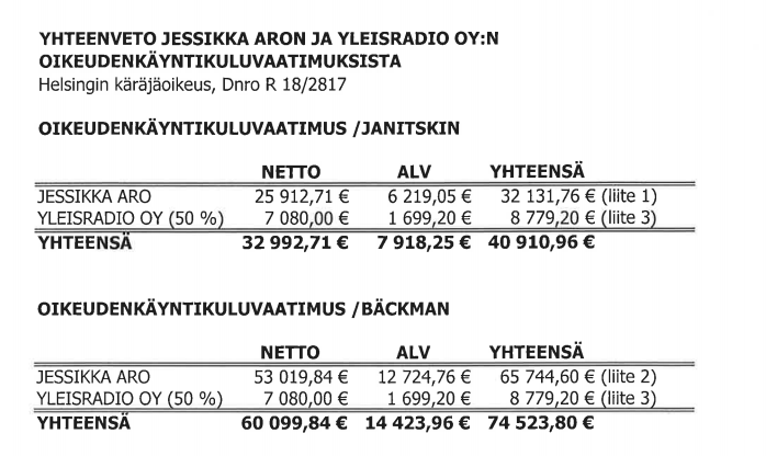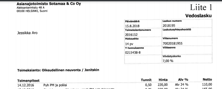 Sotamaa Oy:n lasku Jessikka Aron käräjöinnistä Ilja Janitskinin ja Johan Bäckmanin kanssa, s 1