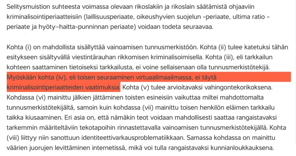 Yleisenä johtopäätöksenä perustelumuistion kohdista 182 ja 183 voidaan todeta, että kaikkia esimerkkeinä mainittuja tekotapoja ei ole sellaisenaan perusteltua taikka edes mahdollista kriminalisoida, eikä yleissopimus siihen velvoitakaan. – – tunnusmerkistö on mahdollista rakentaa laillisuusperiaatteen tarkkarajaisuusvaatimusta loukkaamatta siten yleisemmäksi, että yleissopimuksen tarkoitus toteutuisi. Tällöin huomio kiinnittyy siihen, että tunnusmerkistön olennaisia elementtejä olisivat tietyt tekotavat, toisen tahallinen ja toistuva häirintä, menettelyn oikeudettomuus sekä pelkotilan synty menettelyn tyypillisenä seurauksena. Verbi-ilmaisu ”vainoaa” olisi rikoslain tekotapana uusi. (Finlex: HE19/2013, Nykytilan arviointia)