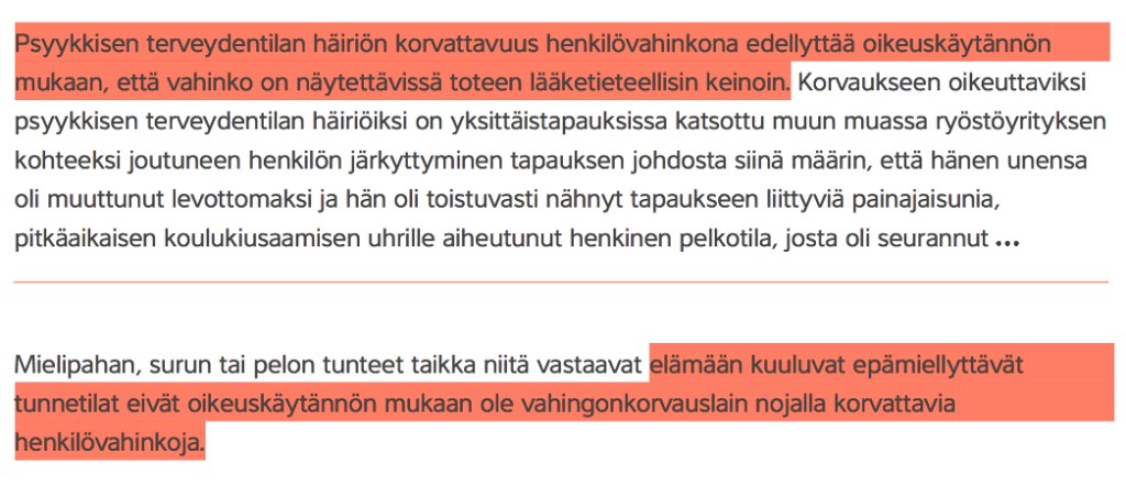Vahingonkorvauslain esitöiden (HE 167/2003) mukaan lähtökohtana on ”korvauksettomuusolettamus”. Tämä on myös minun vaatimukseni täällä oikeudenkäynnissä: ehdottomasti ei ole mitään perustetta millekään euromääräiselle korvaukselle.