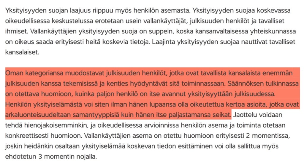 ”Henkilö on itse kaventanut yksityiselämän piirin omien toimiensa johdosta, kun tuo jatkuvasti yksityisasioitaan julkisuuteen.” (s. 152–153)