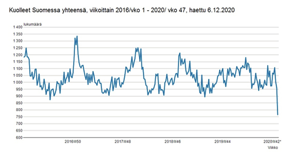 Suomessa, kuten monissa muissakin maissa, kuolleisuus ei ole koronavuonna 2020 ylittänyt tavanomaista, päinvastoin kuolleisuus oli 2020 matalampi kuin edeltävinä vuosina. Tauti on ollut vaarallinen vain valtamedian pelonlietsonta-kampanjassa.