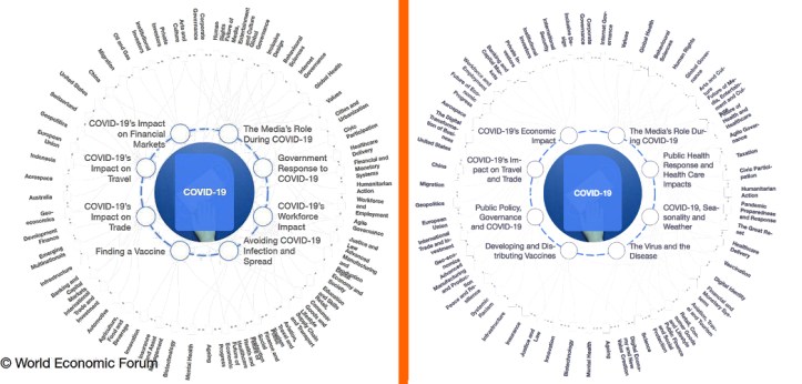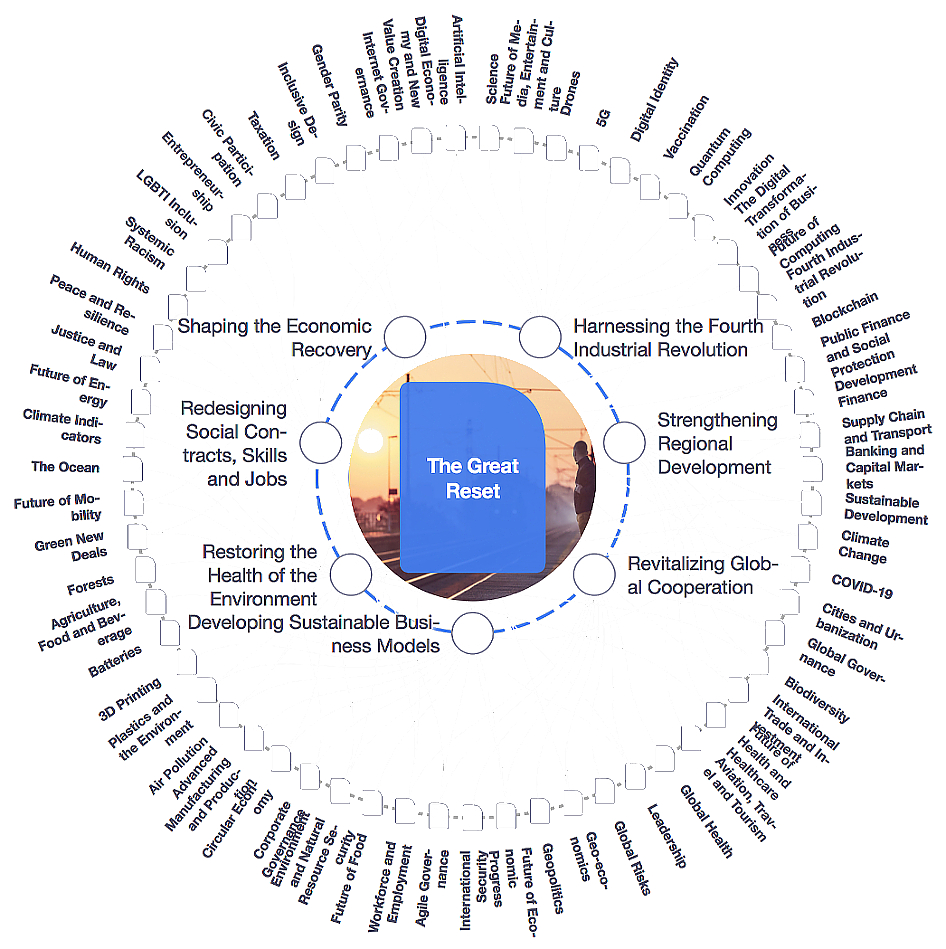 WEF:n Strategic Intelligence -grafiikka on rakennettu koronaviruksen kuvaa muistuttavan kolmekehäisen ympyrän muotoon. Uloimman kehän asiat ovat linkkejä, jotka avautuvat uusiksi keskiöiksi, joiden ympärillä asioita, joista lähtee lankoja jne. Tasoja väitetään olevan parisataa, jos koko sykkyrää kannattaa edes ajatella kerrostuneena.