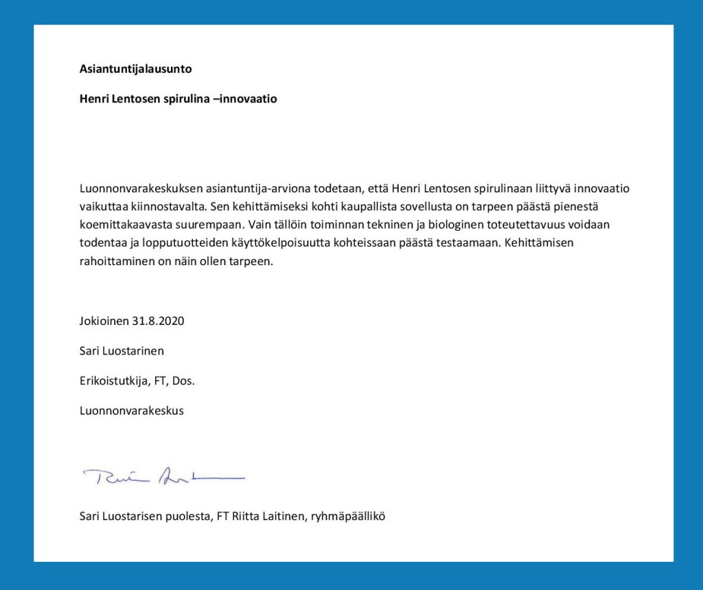 Yritys tuottaisi ihmisille superfoodiksi spirulinaa, sekä rakentaisi laitteistoja maatiloille. Alussa eräs kaveri rahoitti muutamalla tonnilla alkututkimuksia, kiitos hänelle. Kiitos Ruohonjuuri Oy heidän viime vuonna myöntämästään 3000 euron apurahasta. Ilman sitä emme olisi näin pitkällä ja valmiina uuteen askeleeseen.