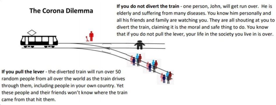 AvoinMedia julkaisee Helsingin yliopiston täysinpalvelleen TARTUNTATAUTIOPIN professorin kirjoituksen, jossa filosofisen ongelman avulla pohditaan kovan linjan KORONATOIMIen moraalista oikeutusta. Sodassa SARS-CoV-2-infektiota vastaan ”collateral damage” on valtava – etenkin laihaan hyötyyn nähden.