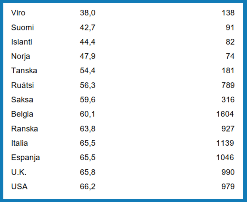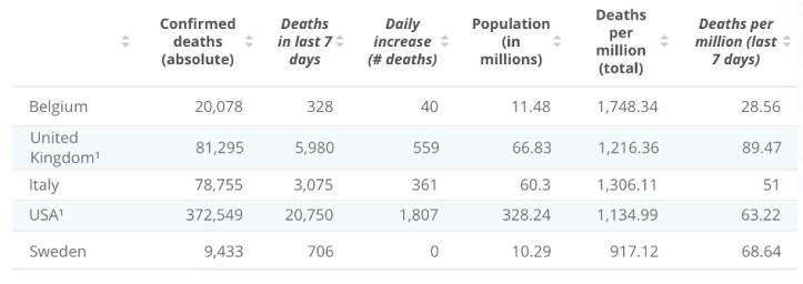 Toimitus huomauttaa * Ruotsia suurempia kuolleisuuslukuja saatiin tiukoista rajoitustoimenpiteistä huolimatta esimerkiksi Belgiassa, Iso-Britanniassa, Italiassa ja Yhdysvalloissa, huomauttaa myös Ville-Veikko Elomaa: *