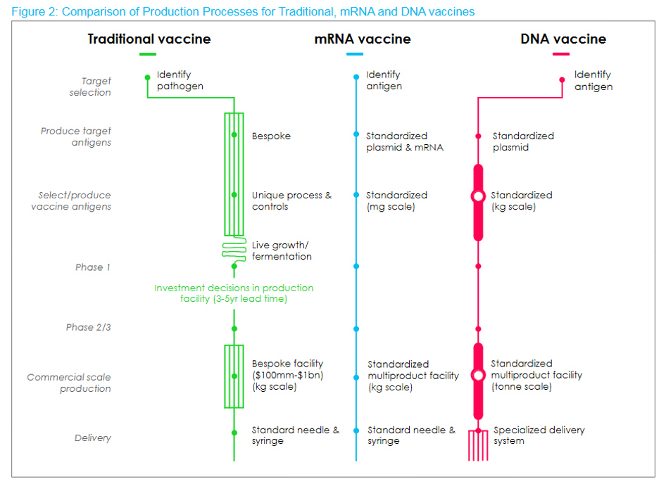 Perinteisen (traditional) rokotteen, mRNA-rokotteen ja DNA-rokotteen tuotantovaiheiden vertailua.