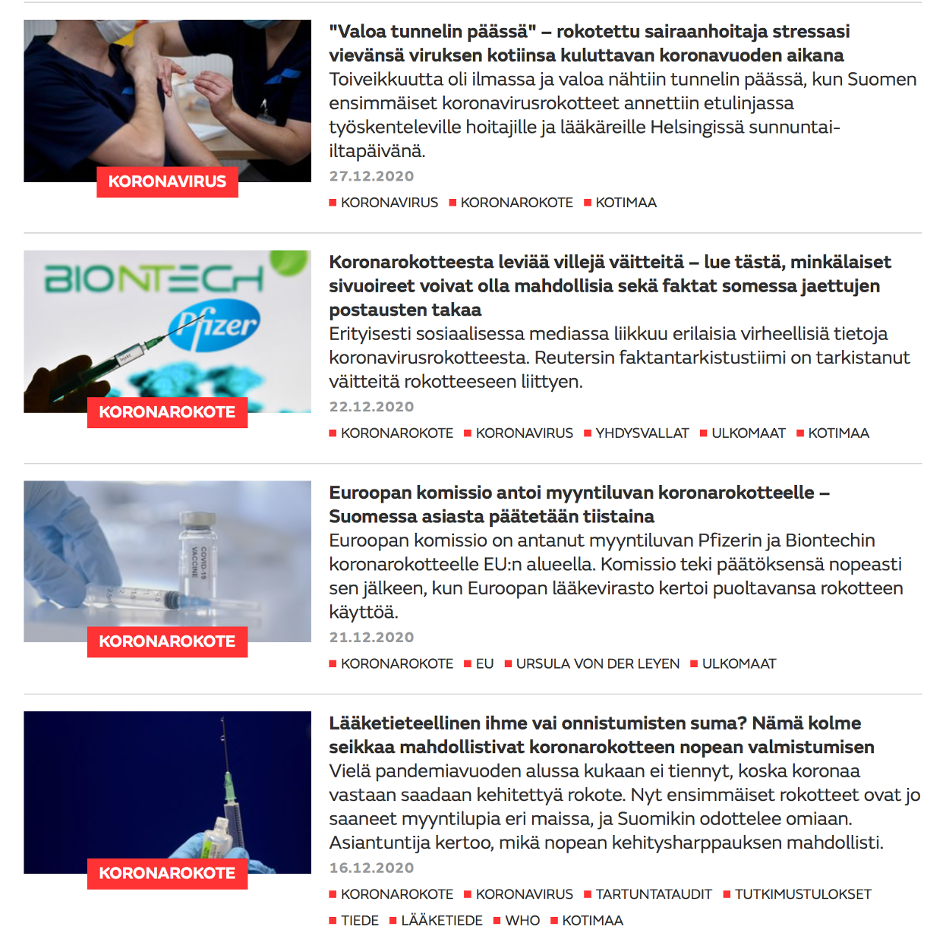 Lepistö, Joonas | MTV (27.1.2021): Koronarokotteesta tehtyjen haittavaikutusilmoitusten määrä kaksinkertaistui viidessä päivässä – vakavaksi arvioituja ilmoituksia on nyt liki 40. https://www.mtvuutiset.fi/artikkeli/koronarokotteesta-tehtyjen-haittavaikutusilmoitusten-maara-kaksinkertaistui-viidessa-paivassa-vakavaksi-arvioituja-ilmoituksia-on-nyt-liki-40/8048494#gs.rt7d0g