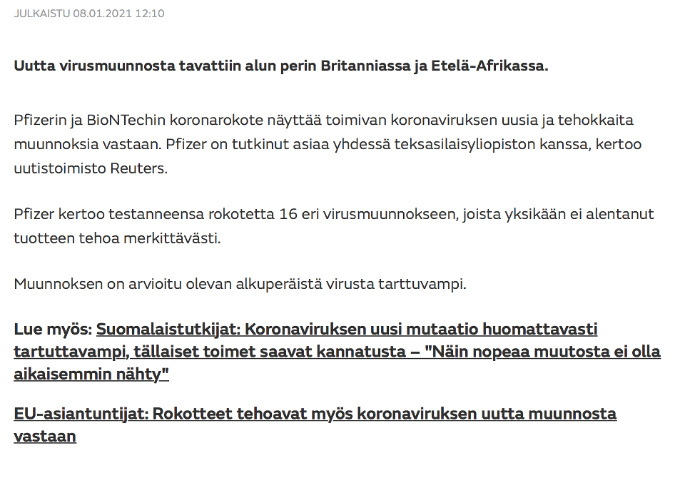 Reuters | MTV (8.1.2021): Pfizerin ja BioNtechin rokote näyttää tehoavan koronamuunnosta vastaan. https://www.mtvuutiset.fi/artikkeli/pfizerin-ja-biontechin-rokote-nayttaa-tehoavan-koronamuunnosta-vastaan/8031576#gs.ru8486