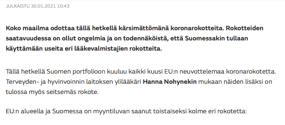 Aaltio, Anton | MTV (30.1.2021): Koronarokotteen haittavaikutuksista tehty vajaat 200 ilmoitusta Suomessa, niistä 54 on vakavia – nämä ovat yleisimmät oireet. https://www.mtvuutiset.fi/artikkeli/koronarokotteen-haittavaikutuksista-tehty-185-ilmoitusta-suomessa-niista-54-on-vakavia-nama-ovat-yleisimmat-oireet/8050592#gs.ruohr4
