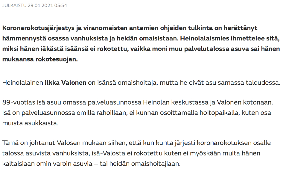 Luhtala, Jouko | MTV (1.1.2021): Hoivakotien asukkaiden koronarokotukset alkavat Helsingissä – ”Vierailurajoituksiin rokotukset eivät vielä vaikuta”. https://www.mtvuutiset.fi/artikkeli/hoivakotien-asukkaiden-koronarokotukset-alkavat-helsingissa-valitettavasti-vierailurajoituksiin-rokotukset-eivat-viela-vaikuta/8027830#gs.rtz8v0
