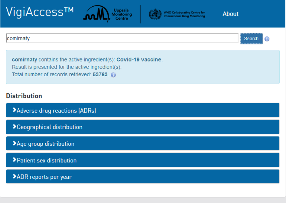 Thank you for your message. Your observation is correct and it is an expected behaviour in VigiAccess. The reason is that VA doesn’t show any statistics on a product specific level (individual trade name, like comirnaty), but aggregated to the level of the active ingredient, i.e. the granularity is limited. There is a message in the interface intended to explain this to the user; when you search for ’comirnaty’ you get the message ’comirnaty contains the active ingredient(s): Covid-19 vaccine. Result is presented for the active ingredient(s).’ I hope this information was helpful. Kind regards, Helena.’ ” *