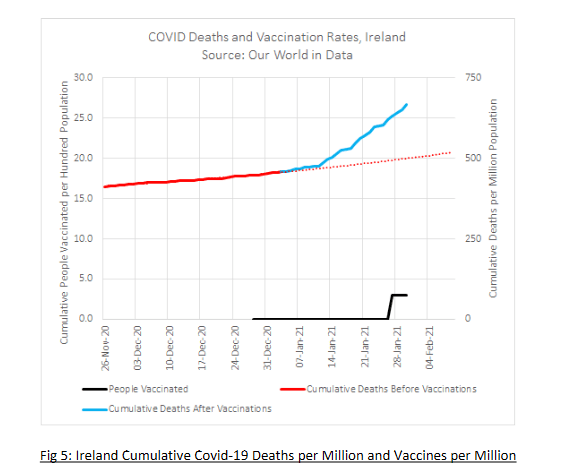Irlannin suuntaus on samankaltainen kuin Isossa-Britanniassa. Kuolleisuus oli vakiintunut joulukuun puoliväliin asti, jolloin rokotukset alkoivat. Kuolleisuus viisinkertaistui tammikuun viimeisinä viikkoina.