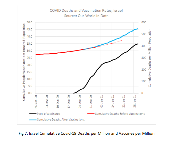 Israelissa on maailman korkein koronarokotekattavuus (58 annosta per 100 henkilöä 20.12.2020 jälkeen). Koronasairastuneiden määrä alkoi kasvaa rokotusten alettua. UKMFAn mukaan 17% sairaalaan joutuneista oli ”saanut” ensimmäisen annoksen Pfizer/BioNTechin rokotetta.
