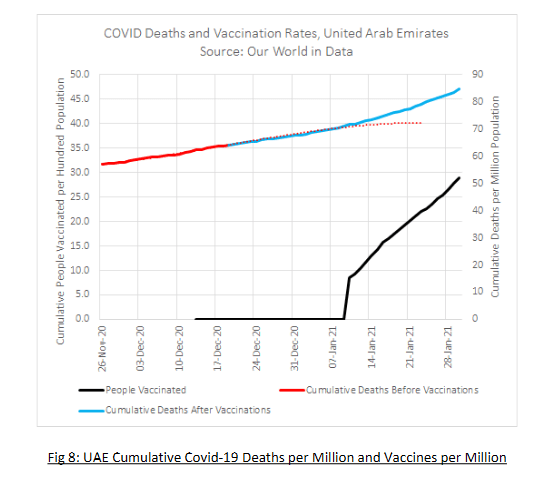 Iso-Britannia aloitti rokotukset joulukuun alkupuolella ja kiihdytti tahtia joulukuun puolivälissä. Kuolleiden määrän kasvu korreloi rokotettujen määrän kanssa.