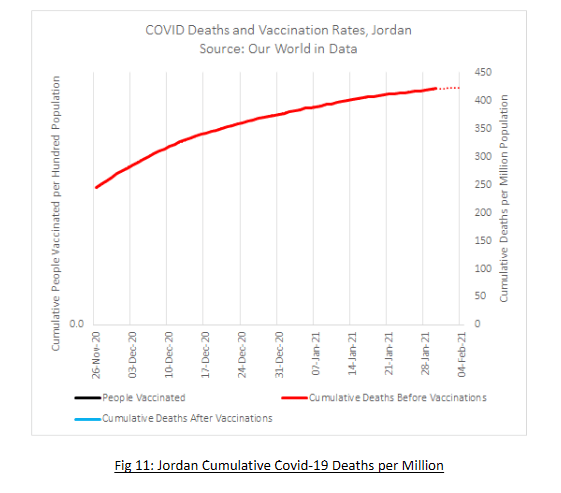 Jordania ei ole aloittanut koronarokotuksia. Maassa ei ole nähtävissä ilmiötä kasvaneista kuolinluvuista, kuten rokottaneissa naapurimaissa Israelissa, Bahrainissa ja Arabiemiraateissa (UAE).