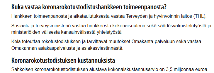 ”Myöskään EU:n ja WHO:n tasolla ei ole yksimielisyyttä, missä tilanteissa voitaisiin velvoittaa koronarokotustodistuksen käyttöä […] varmistetaan, että Suomen koronarokotustodistus olisi yhteensopiva kansainvälisen mallin kanssa…