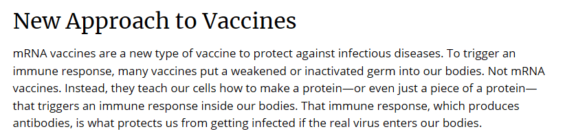 Yhdysvaltain tartuntatautivirasto CDC kertoo mRNA-geeniterapiapiikkien ”opettavan soluillemme, kuinka valmistaa [viruksen] proteiinia – tai edes [viruksen] proteiinin osaa – joka laukaisee immuunireaktion.”