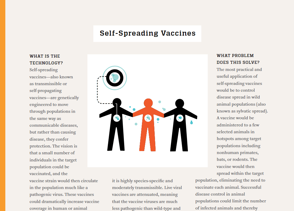 Technologies To Address – Global Catastrophic Biological Risks (s. 45): ”Itsestään leviävät rokotteet”