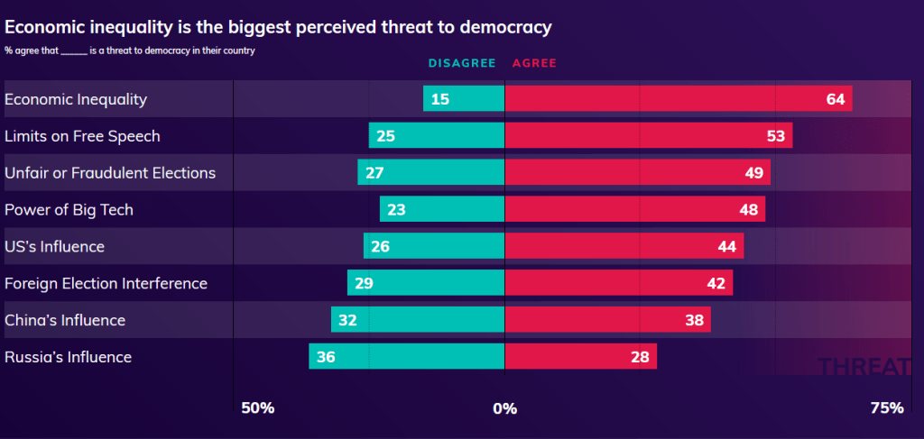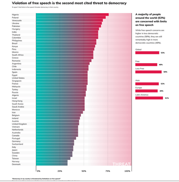 ”Sananvapauden loukkaaminen nähdään toiseksi suurimpana uhkana demokratialle. Suurin osa (53%) maailman ihmisistä on huolissaan sananvapauden rajoittamisesta.