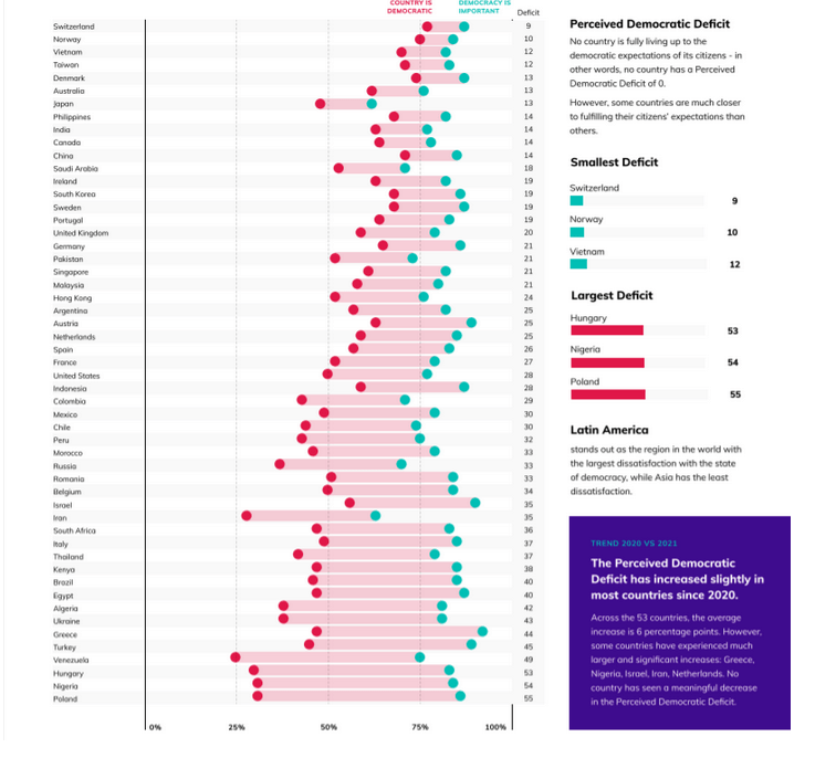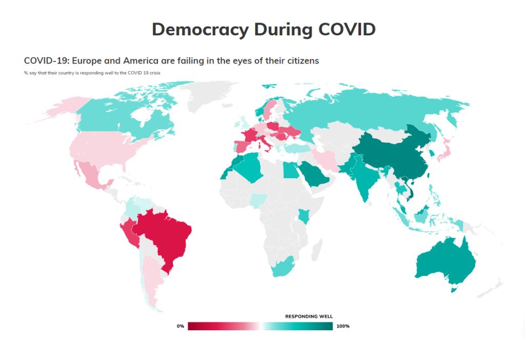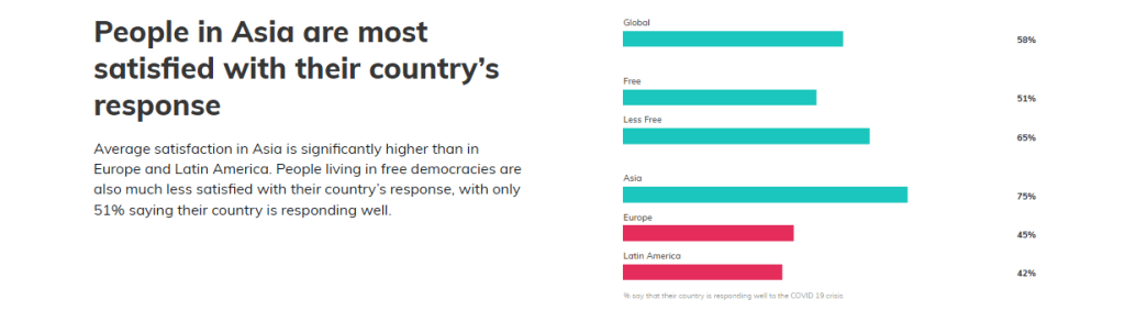 Koronastakin luonnollisesti kyseltiin sekä demokratian tilasta koronatoimiaikana. Vuonna 2020 jopa 70% vastanneista oli tyytyväisiä hallitusten toimintaan, vuonna 2021 lukema on pudonnut 58 prosenttiin. Suurinta tyytyväisyys on Aasian maissa. Yhdysvallat ja EU ovat vastaajien mielestä epäonnistuneet.