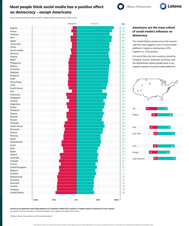 ”Suurin osa ihmisistä ajattelee sosiaalisella medialla olevan vahvistava vaikutus demokratiaan – paitsi Yhdysvalloissa.”