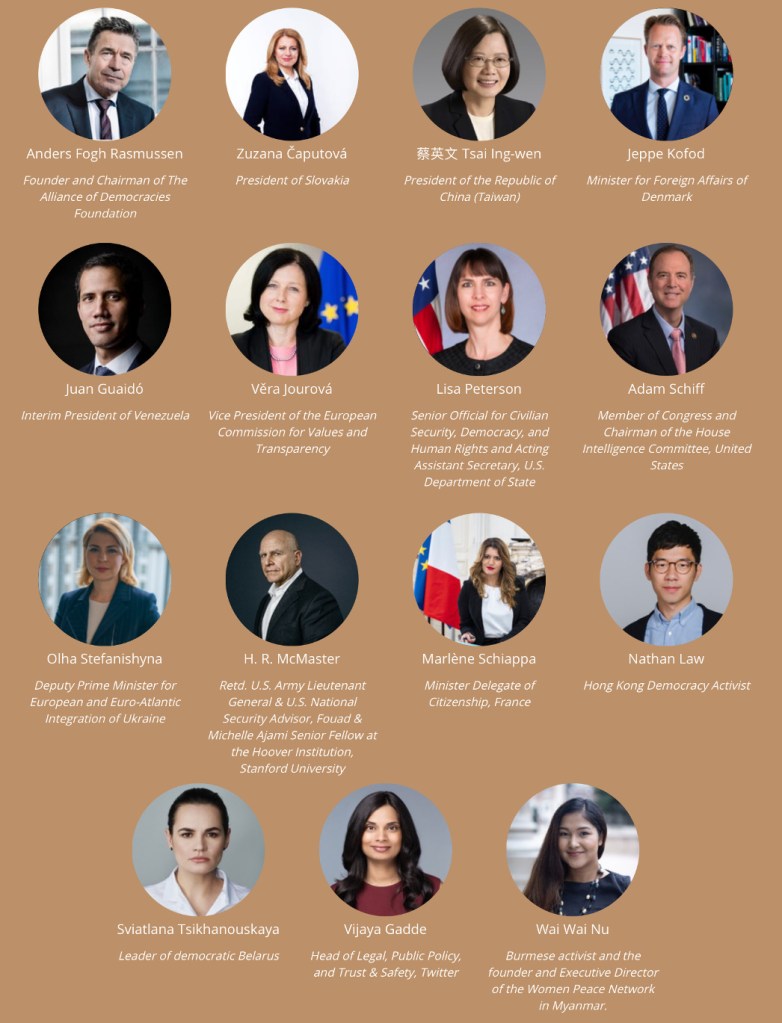 Kööpenhaminassa järjestetään 10-11.5. 2021 Copenhagen Democracy Summit 2021, jonka puhujalista on kertova (kuva alla). Puhujiksi on valikoitunut vain Yhdysvaltain tukemaa ”poliittista oppositiota” sekä NATOn kannattajia.