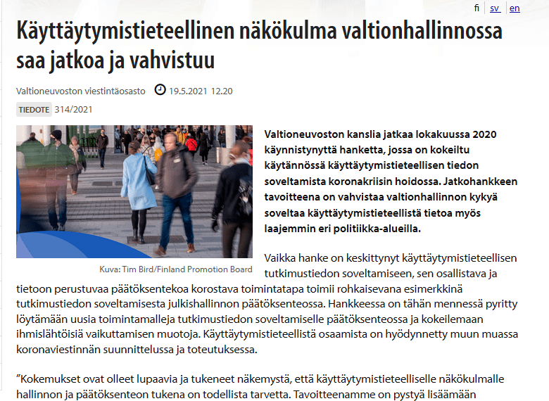Suomen valtioneuvoston, siis Marinin hallituksen, joka myös on hakenut neuvoja käyttäytymistieteilijöiltä edistääkseen rokotemyönteisyyttä, viestintäosasto tiedotti 19.5.2021 käyttäytymistieteellisen näkökulman valtionhallinnossa saavan jatkoa ja vahvistuvan.