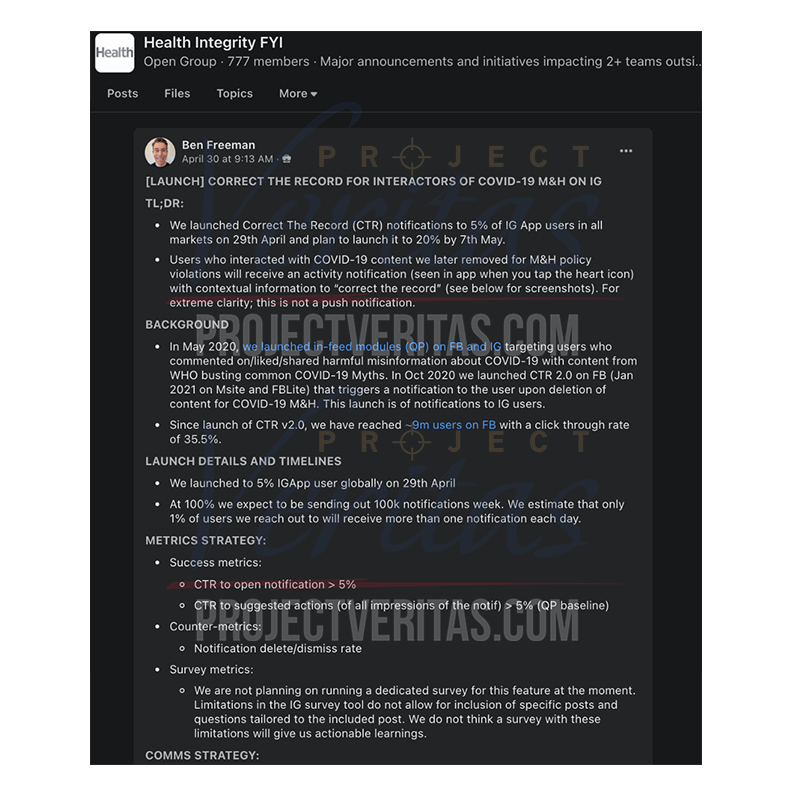 Konservatiivinen, tietovuotoihin ja tutkivaa työtä suorittavien vapaaehtoisten korruption ja epärehellisyyden paljastamiseen omistautunut projekti, Project Veritas, jatkaa paljastusten tekemistä. Tällä kertaa sosiaalisen median alustan, Facebookin, toiminnasta koronatoimiin liittyen.