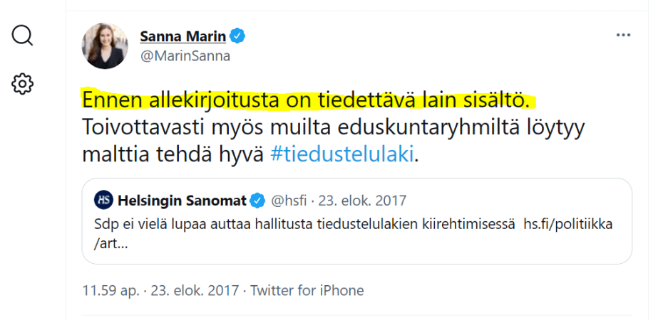 Artikkelikuva: Sanna Marin Twitterissä 23.8.2017