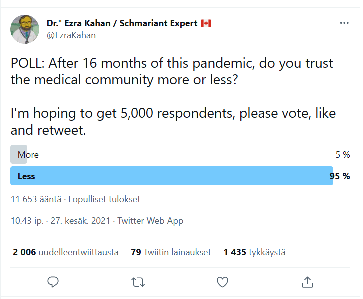 Nimimerkki Dr. Ezra Kahan/Schmariant Expert teki Twitterissä online -kyselyn, jossa tiedustellaan ”luotatko lääketieteelliseen yhteisöön enemmän vai vähemmän, kun tätä pandemiaa on nyt kestänyt 16 kuukautta?”