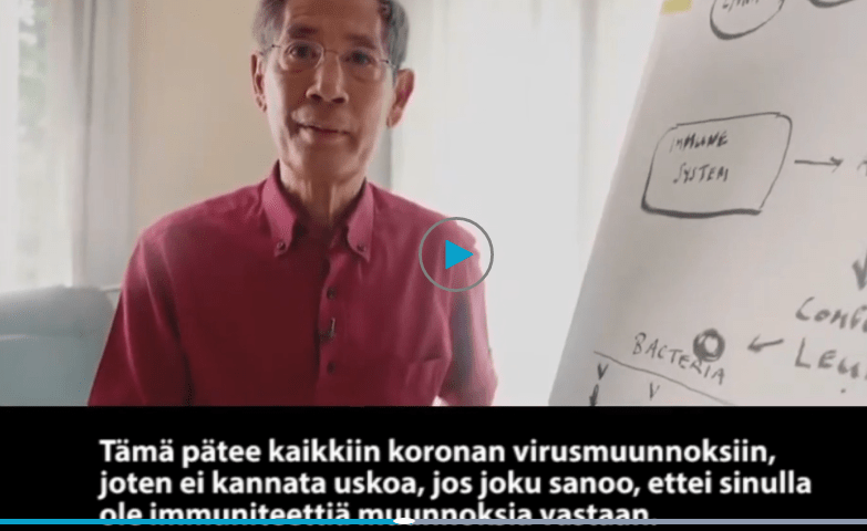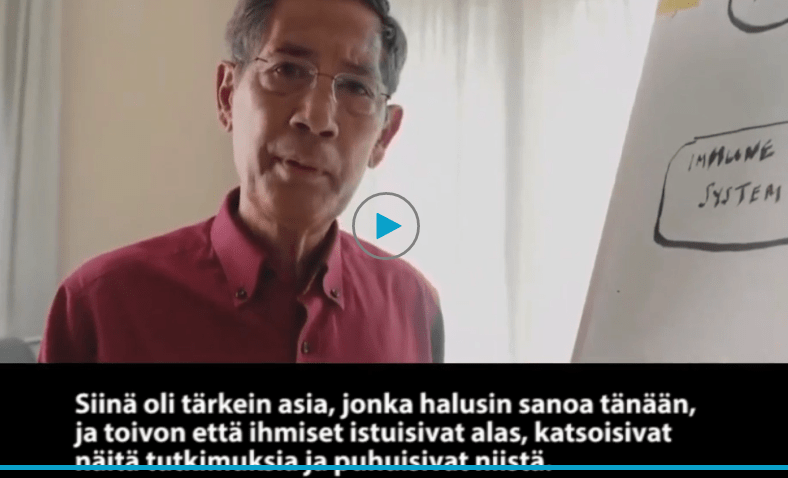 Saksan Mainzissa sijaitsevan Johannes Gutenberg -yliopiston emeritusprofessori, lääketieteellisen mikrobiologian instituutin pitkäaikainen entinen johtaja, mikrobiologi ja immunologi Sucharit Bhakdi on tehnyt lyhyen videon, jossa hän selittää kansantajuisesti hiljattain julkaistujen tutkimusten löydöksiä, ja mitä tulokset merkitsevät. Video on nähtävissä myös suomeksi tekstitettynä.