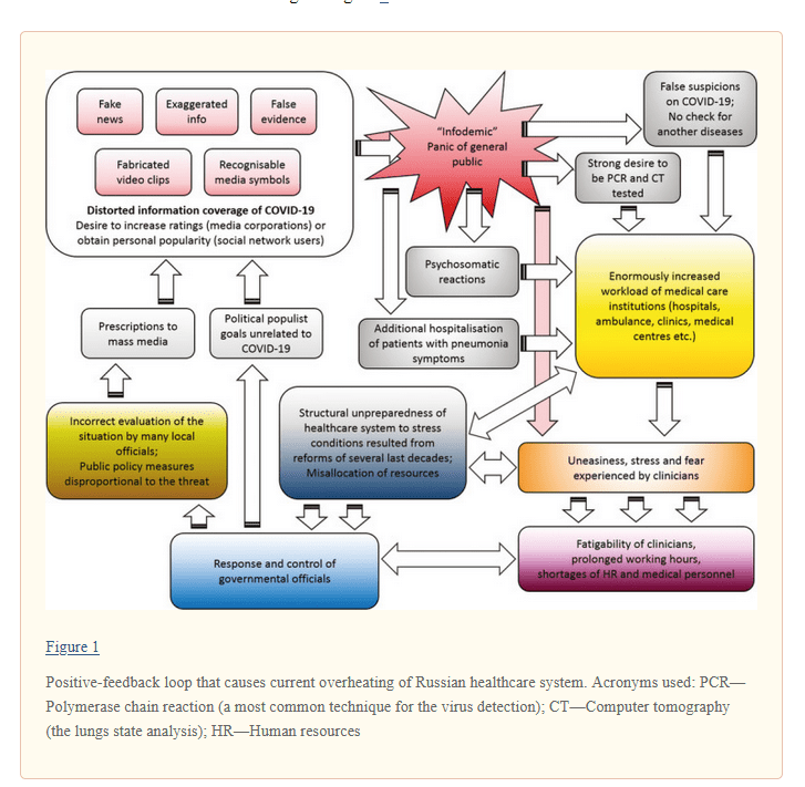 Venäjällä on tutkittu uutisoinnin vaikutusta ihmisiin ja terveydenhuoltoalan henkilökuntaan sekä miten uutisointi on vaikuttanut terveyspuolen ylikuormitukseen. Löydösten perusteella median pelottelevalla, liioittelevalla ja väärää tietoa levittävällä uutisoinnilla on ollut negatiivinen vaikutus sekä ihmisten terveyteen että terveydenhuoltoalan työntekijöiden jaksamiseen paniikissa olevien ihmisten tukkiessa sairaaloita, mistä on seurannut kapasiteetin ylikuormitusta.