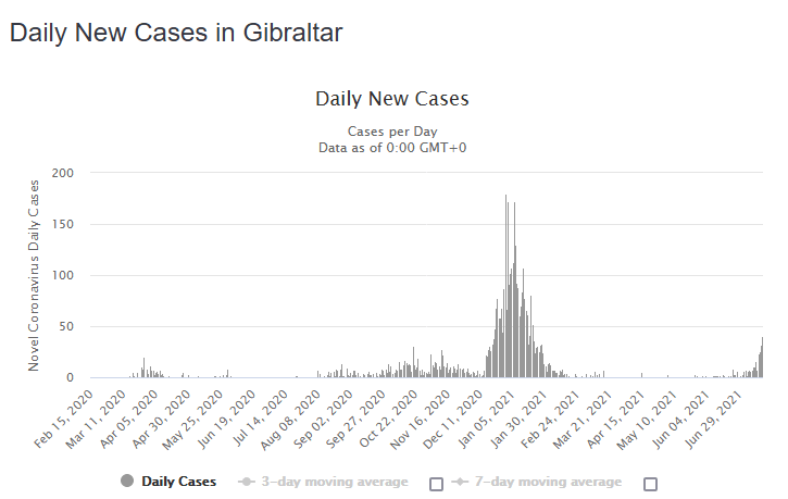 Monissa suuren rokotuskattavuuden maissa suunta uusissa tartunnoissa on ylöspäin, myös sataprosenttisesti piikitettäneellä Gibraltarilla.