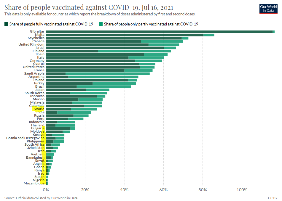 Gibraltar ilmoittaa piikittäneensä 100% väestöstään. Maltalla 2 annosta (”täysin suojattu”) on ottanut 80,40% ja Seychelleilla 69,29% väestöstä; Kanada 48,45% (yhteensä 70,05%), Iso-Britannia 52,36% (yhteensä 68%), Israel 60,36% (yhteensä 66,34%), Kypros 47,41% (yhteensä 55,83%) ja Suomi 26,56% (yhteensä 63,96%).
