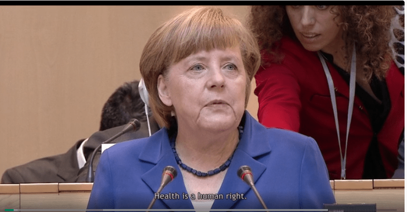 Artikkelikuva: Angela Merkel pitämässä rokotekampanjapuhetta: ”Terveys on ihmisoikeus”. Kuva Lillian Franckin dokumenttielokuvasta TrustWHO.