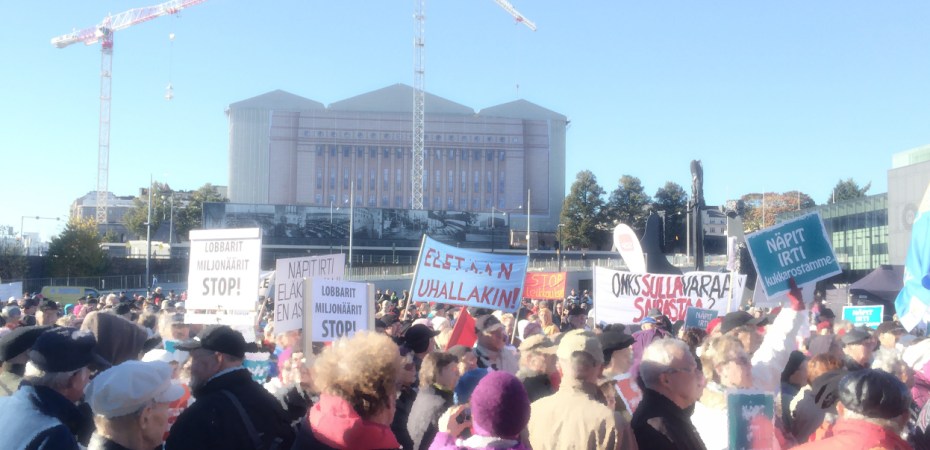 Artikkelikuva on vuonna 2015 eläkeläisten mielenosoituksesta ottamani. Tuolloin eduskuntatalon rakenteet olivat remontissa – liekö epäonnistunut samoissa massiivisissa määrin kuin vuoden 2019 sisältö-uudistus? Vaikea uskoa.