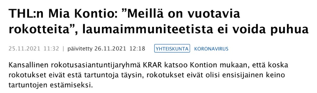 Iltalehti otsikoi 19.11.2021: ”Kiuru: Hallitus haluaa kolmannen rokotuksen nopeasti kaikille”
