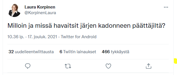 Helsingin kaupunginvaltuutettu, asianajaja Laura Korpinen (ps) kysyy tviitissään, ”Milloin ja missä havaitsit järjen kadonneen päättäjiltä?”