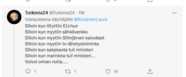 - JP Tuominen: ”Melko pian tämän [Marinin] hallituksen astuttua valtaan.”