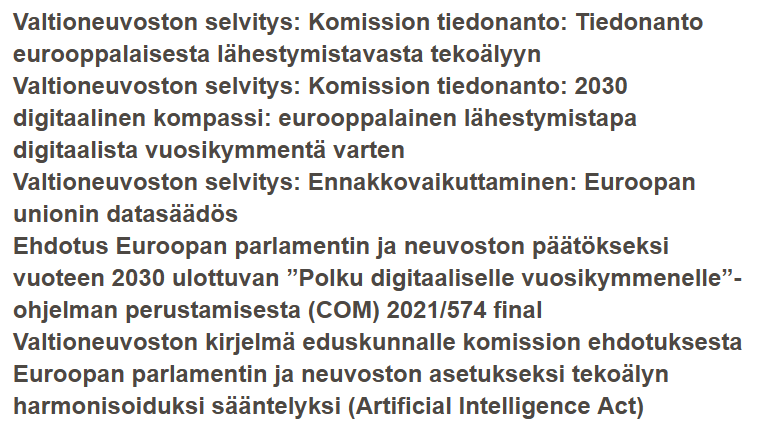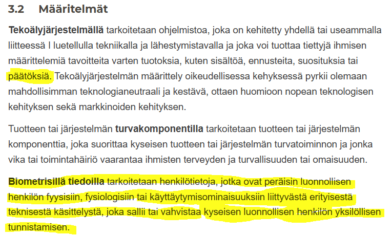 U 28/2021 vp: Valtioneuvoston kirjelmä eduskunnalle komission ehdotuksesta Euroopan parlamentin ja neuvoston asetukseksi tekoälyn harmonisoiduksi sääntelyksi (Artificial Intelligence Act) antaa tietää, että EU:n digitalisaatiohanke tarkoittaa myös reaaliaikaista ja jälkikäteen tapahtuvaa biometristä tunnistamista, koska komissio esittää näiden välille erottelua, joka vaatii sääntelyä. ”Asetusehdotuksen maininnasta sotilaallisiin tarkoituksiin kehitettyjen ja käytettyjen tekoälyjärjestelmien rajautumisesta soveltamisalan ulkopuolelle valtioneuvosto toteaa kannassaan, että jatkovalmisteluissa tulisi täsmentää huomioimaan vastaavalla tavalla erikseen sisältyvin osin myös kansallisen turvallisuuden ylläpitämiseen sisältyvät tarkoitukset.”