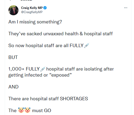 Artikkelikuvana Yhdistynyt Australia -puolueen (UAP) puheenjohtajan ja parlamentaarikon, Craig Kellyn tviitti The Sydney Morning Heraldin uutisesta. ”Jäikö minulta jotain huomaamatta? Rokottamaton terveydenhuoltohenkilökunta on erotettu joten sairaaloissa on vain rokotettua henkilökuntaa MUTTA yli tuhat täysin rokotettua on nyt karanteenissa saatuaan tartunnan tai altistuttuaan. Seurauksena henkilökuntavajetta. Pellet täytyy poistaa.” Show jatkukoon.