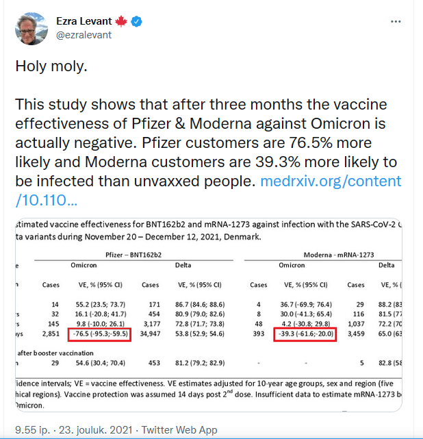 Tanskalainen, MedRxivissa julkaistu (pre-print) kohorttitutkimus ”Vaccine effectiveness against SARS-CoV-2 infection with the Omicron or Delta variants following a two-dose or booster BNT162b2 or mRNA-1273 vaccination series: A Danish cohort study” on saanut tulokseksi, että Pfizer/BioNTechin ja Modernan kokeellisen, testivaiheessa olevan mRNA-geeninanoteknologia -koronapiikin ottaneilla suojateho on negatiivinen Omikron-varianttia vastaan, Ezra Levant kommentoi Twitterissä. Rokotetut saavat Omikron-tartunnan todennäköisemmin kuin rokottamattomat.