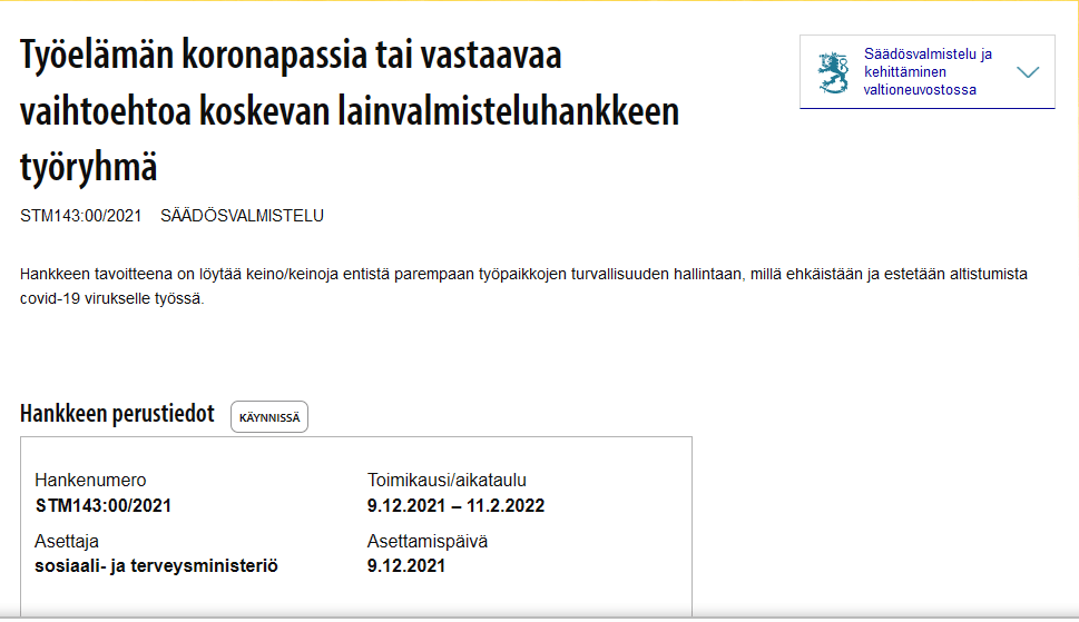 Valmistelun tavoitteena on löytää keino/keinoja entistä parempaan työpaikkojen turvallisuuden hallintaan, millä ehkäistään ja estetään altistumista covid-19 virukselle työssä. Työryhmän toimikausi on 9.12.2021-11.2.2022